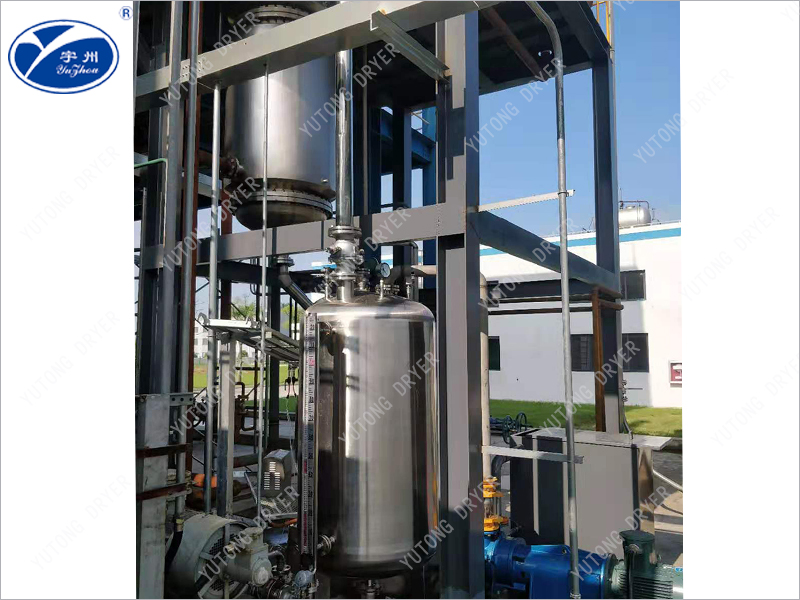 The material enters the evaporator radially from above the heating zone, and is distributed to the heating wall of the evaporator through the distributor. Then, the rotating scraper continuously and uniformly scrapes the material into a thin and uniform liquid film on the heating surface, and pushes it downwards in a spiral shape. During this process, the rotating scraper ensures continuous and uniform liquid film to generate high-speed turbulence, and prevents the liquid film from coking and scaling on the heating surface, thereby improving the total transfer coefficient. Light components are evaporated to form a steam stream that rises and passes through a vapor-liquid separator to reach an external condenser directly connected to the evaporator. Heavy components are discharged from the cone at the bottom of the evaporator.
