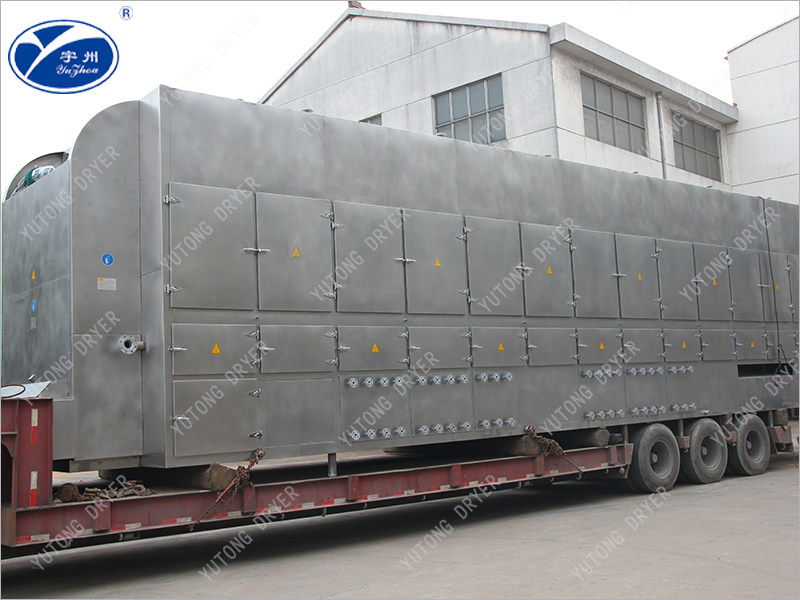 2、the series of belt dryer to be processed materials using multi-layer mobile stainless steel mesh belt or vibration plate, hot air flow through the mesh belt and the material layer on the bottom up, heat exchange uniform, sufficient, high production efficiency, good product quality, with a cold layer and rotary feeding device, low discharge temperature, conducive to timely packaging.