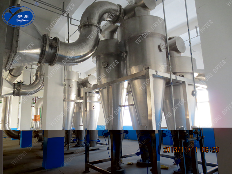 經(jīng)過初、中效過濾的環(huán)境空氣由干燥系統(tǒng)鼓風(fēng)機(jī)鼓入蒸汽散熱器加熱至工藝設(shè)定溫度,進(jìn)入閃蒸干燥主機(jī),與經(jīng)過螺旋加料器送入干燥主機(jī)的待干燥濾餅,在干燥主機(jī)唄完成傳熱介質(zhì)的干燥過程,氣固混合物由布袋除塵器分離、過濾后,物料被從干燥系統(tǒng)氣體內(nèi)分離出來,排出干燥系統(tǒng),尾氣由引風(fēng)機(jī)排入大氣。