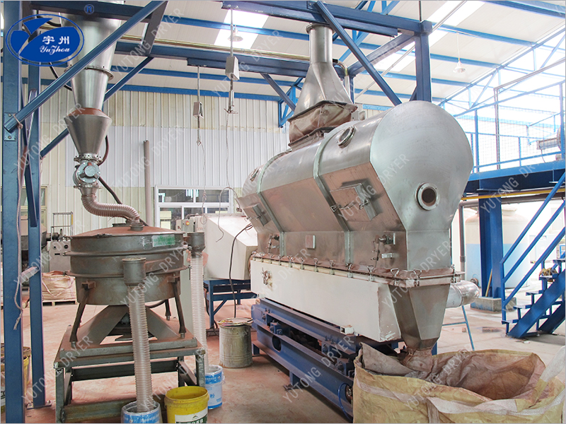 物料為硫酸鎳,具有強酸性及強腐蝕性,我司針對這一特點,在設備制造上進行升級及改進,振動流化床的上箱體和下箱體以及內表壁均采用3mm的玻璃鋼全貼附,振動板采用特制鎳板沖鴨舌孔制作,尾氣排放全部采用耐高溫耐腐蝕的玻璃鋼材料制作。支撐架和支撐管也特別采用了碳鋼特氟龍材料。為了使排放達到良好效果,布袋除塵器的布袋選擇特殊材質,極其耐酸,連引風機變頻調風也采用了FRP制作。此工藝很好的解決了材料干燥過程中遇到的高溫、高腐蝕的難題。
