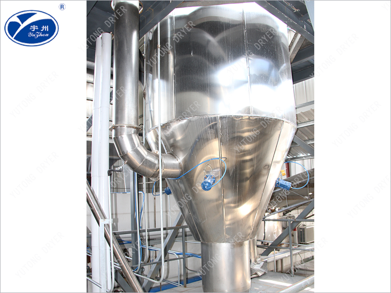 空氣通過濾清器進入加熱器,交換成熱空氣,進去干燥室頂部的熱空氣分配器,使空氣均勻呈旋轉(zhuǎn)狀或平行軸線進入干燥室。料液需經(jīng)過篩后由高壓泵送至設(shè)在干燥室頂中心的噴嘴,將料液均勻的霧化,使液滴的表面積大大增加,與熱空氣相遇接觸,使水份迅速蒸發(fā),在極短的時間里干燥成為顆粒產(chǎn)品,大部分產(chǎn)品由設(shè)在塔底部出料口收集,廢氣和微小粉粒經(jīng)旋 風(fēng)分離器分離,成品由旋風(fēng)分離器下端收集筒收集,廢氣由抽風(fēng)機排出。