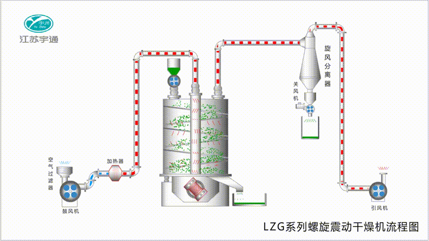 4、物料沿螺旋床自上而下作圓周運動的同時,自身也產生跳躍,從而增加了物料與熱風的接觸,增強了干燥效果。