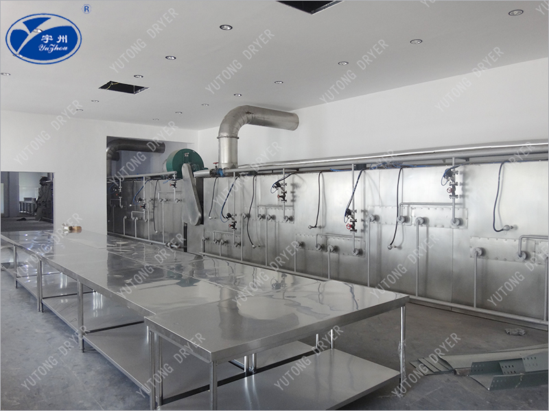 物料由加料器均勻地鋪在網(wǎng)帶上,網(wǎng)帶采用12-60目不銹鋼絲網(wǎng)。由傳動裝置拖動在干燥機內(nèi)移動。干燥機由若干單元組成,每一單元熱風獨立循環(huán),部分尾氣由專門排濕風機排出,廢氣由調(diào)節(jié)閥控制,熱氣由下往上或由上往下穿過鋪在網(wǎng)帶上的物料,加熱干燥并帶走水分。網(wǎng)帶緩慢移動,運行速度可根據(jù)物料溫度自由調(diào)節(jié),干燥后的成品連續(xù)落入收料器中。上下循環(huán)單元根據(jù)用戶需要可靈活配備,單元數(shù)量可根據(jù)需要選取。