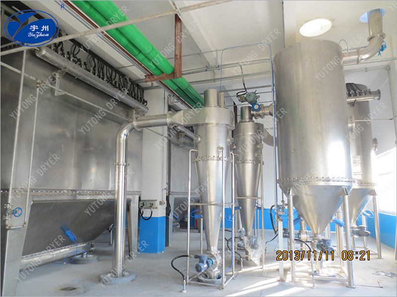 Окружающий воздух, прошедший первоначальную и среднюю фильтрацию, вдыхается вентилятором системы сушки, а горячий воздух, образующийся после теплообмена паром, поступает в главный двигатель сушки флэш - пара. Затем он подается в сухой хост через спиральный питатель для завершения процесса сушки теплоносителя в сухом хосте. Газоустойчивая смесь отделяется циклонным сепаратором и мешковым пылеуловителем, материал отделяется от газа в сухой системе и выбрасывается в атмосферу через вентилятор.