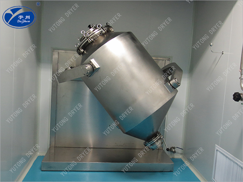 Во время работы смеситель имеет многонаправленное движение, которое ускоряет поток и распространение различных материалов в процессе смешивания. В то же время он избегает сегрегации плотности материала и накопления, вызванных центробежными силами в обычных смесителях. Смешивание не имеет мертвого угла, может эффективно гарантировать хорошее качество смеси. Конструкция: Машина состоит из основания, трансмиссии, электрической системы управления, механизма многонаправленного движения, мешалки и других компонентов. Барабан для перемешивания, находящийся в непосредственном контакте с материалом, изготовлен из нержавеющей стали, а внутренняя и внешняя стенки барабана полированы. Полностью соответствует требованиям GMP。